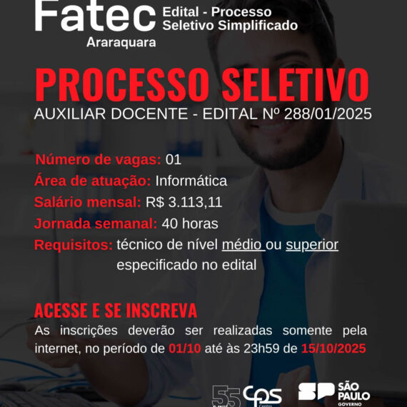 As inscrições ocorrem pelo site https://vestibular.fatec.sp.gov.br/home/ e vão até 07/nov/2025