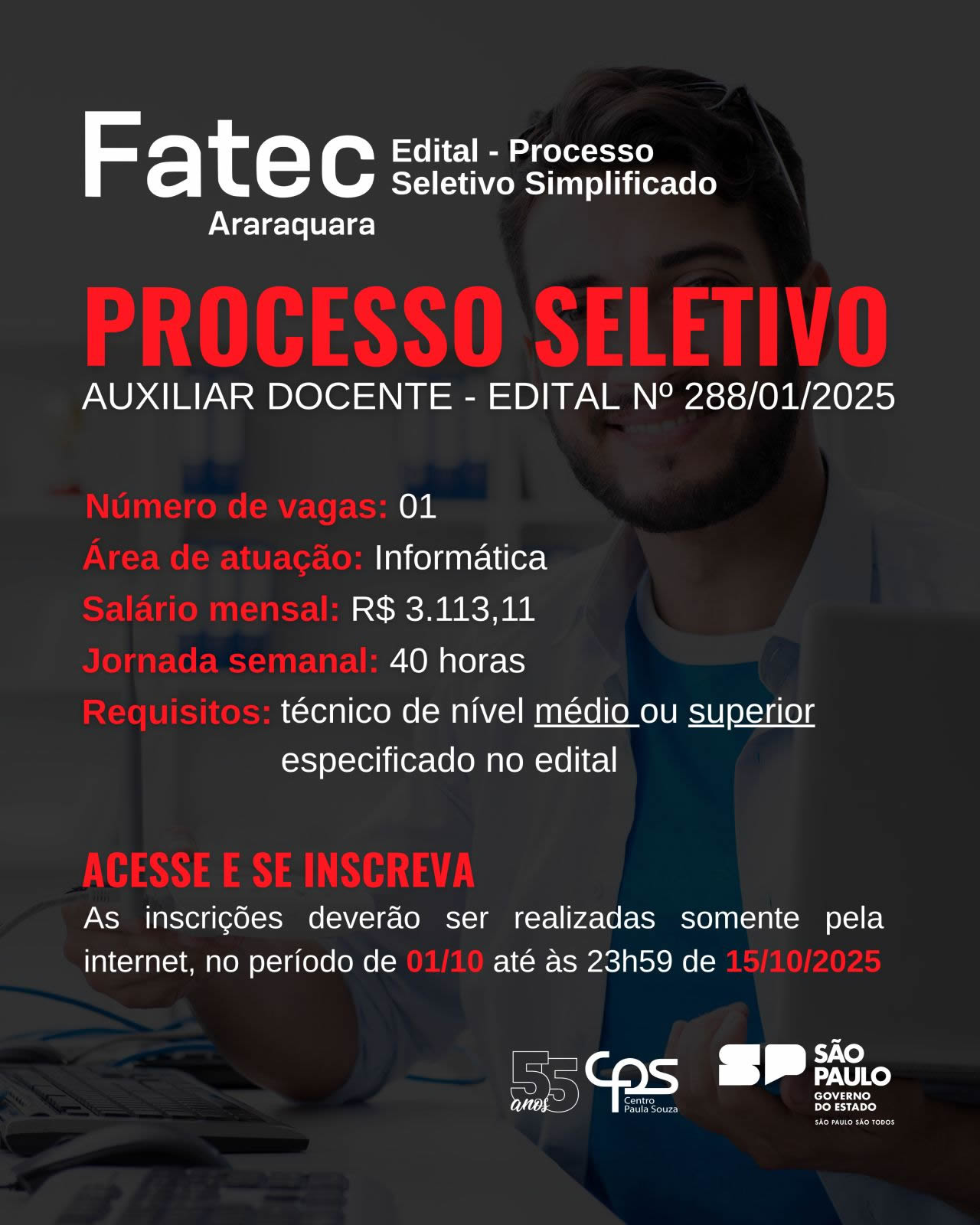 Link do anúncio da vaga no Linkedin: https://www.linkedin.com/posts/fatecararaquara_auxiliardocente-informaertica-centropaulasouza-activity-7379892997833953280-19N1